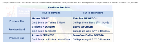Les vidéos des six lauréats sont visibles ici. Une mention spéciale également pour une autre élève de 6ème, Marie-Claire Waimo qui a également participé, avec Thérésa, à ce concours de lecture et dont la qualité de la vidéo a été saluée par l’ensemble des professeurs du collège. Un grand bravo à ces deux élèves pour leur bonne humeur et leur implication dans ce travail de lecture à voix haute ! Une pensée également pour nos lauréates des deux années précédentes, Abysséga Gorodey et Alésié Saoumoé qui ont débuté ce travail de lecture à voix haute et ainsi encouragé les futurs lecteurs et lectrices.
