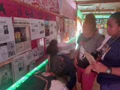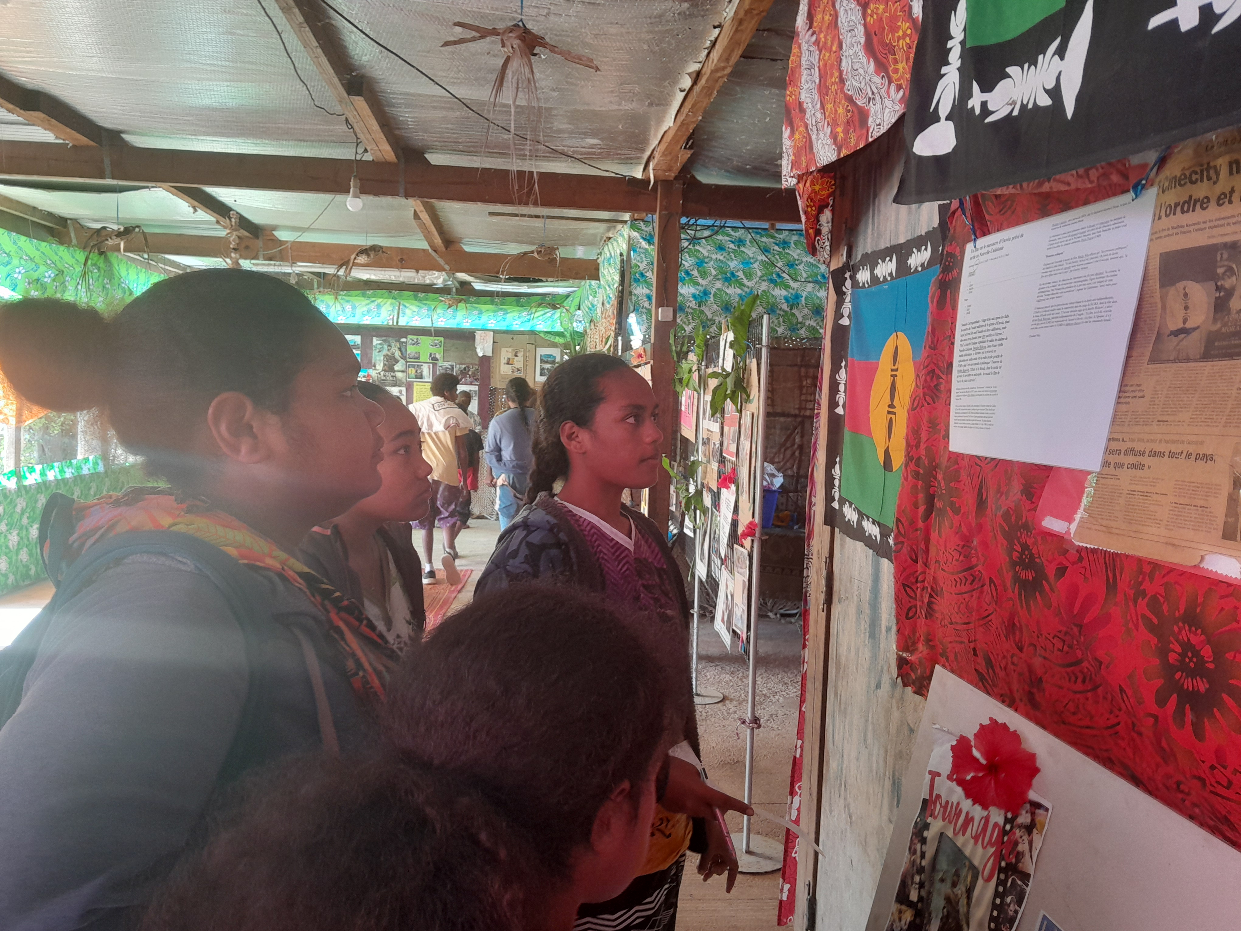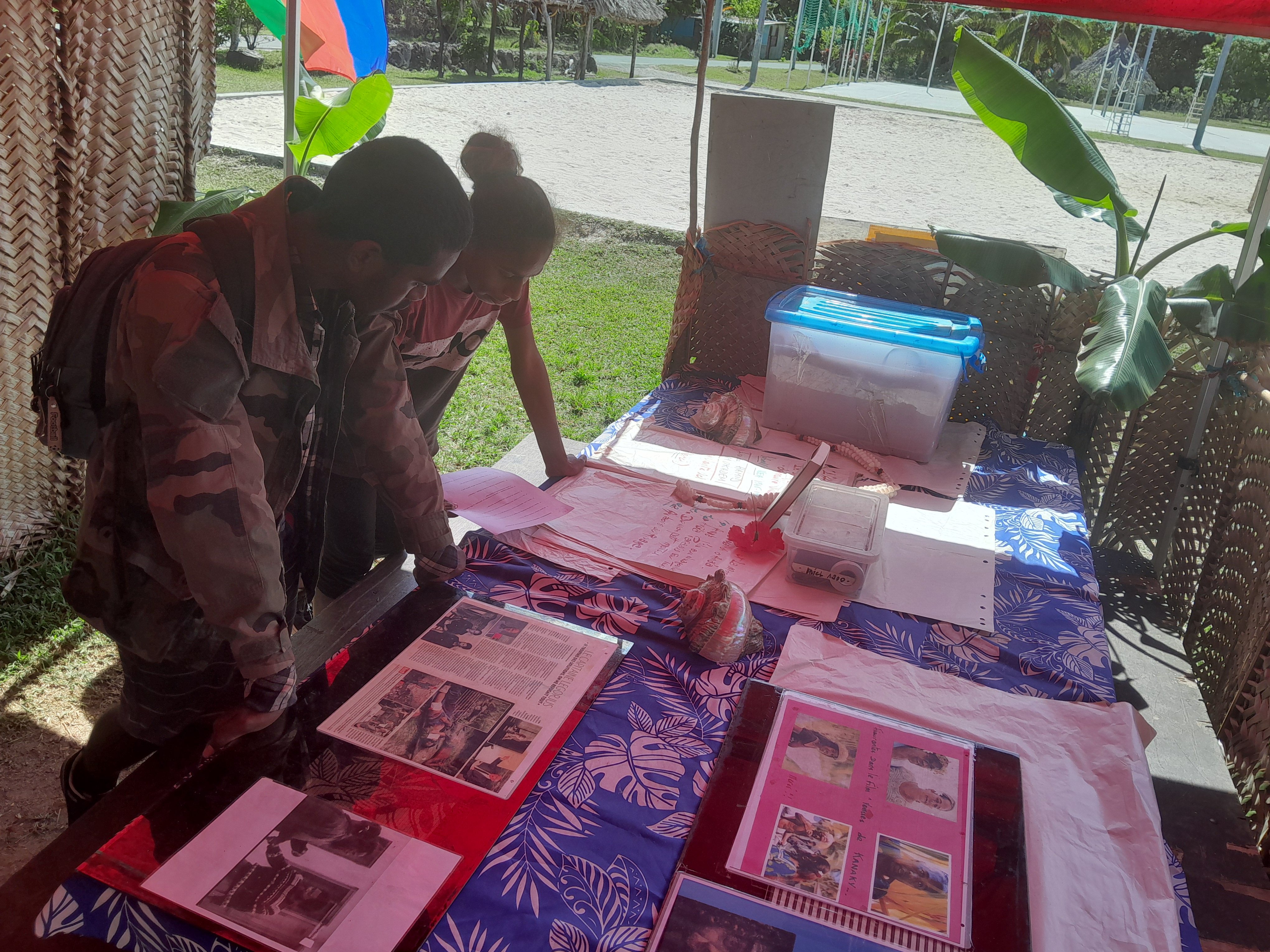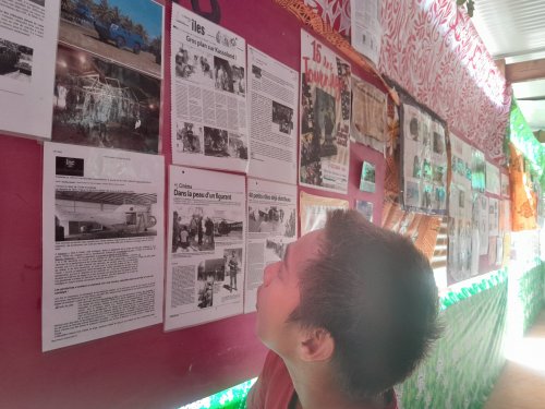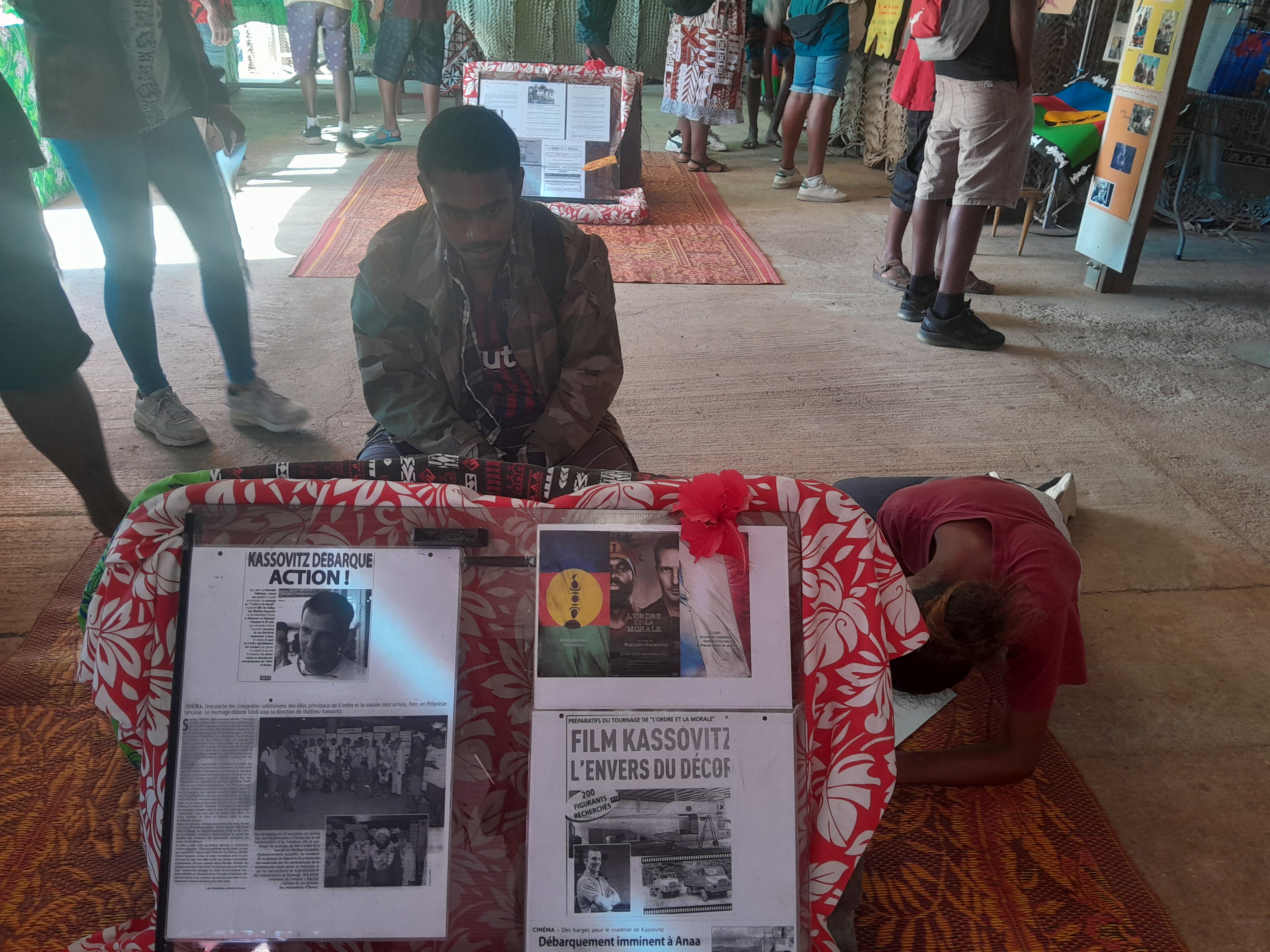 Aux quatre coins de l’exposition, présentée au petit marché de Gossanah, les commentaires et questions fusent. « C’est quoi un figurant ? Et un producteur ? » L’objectif de la sortie scolaire, organisée le 25 septembre, est atteint : les élèves s’interrogent et découvrent l’univers du cinéma (et les métiers qui y sont rattachés). Le tout grâce à cette exposition qui retrace le tournage du film L’Ordre et la morale, en 2010 à Anaa (une île polynésienne située dans l’archipel des Tuamotu).