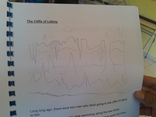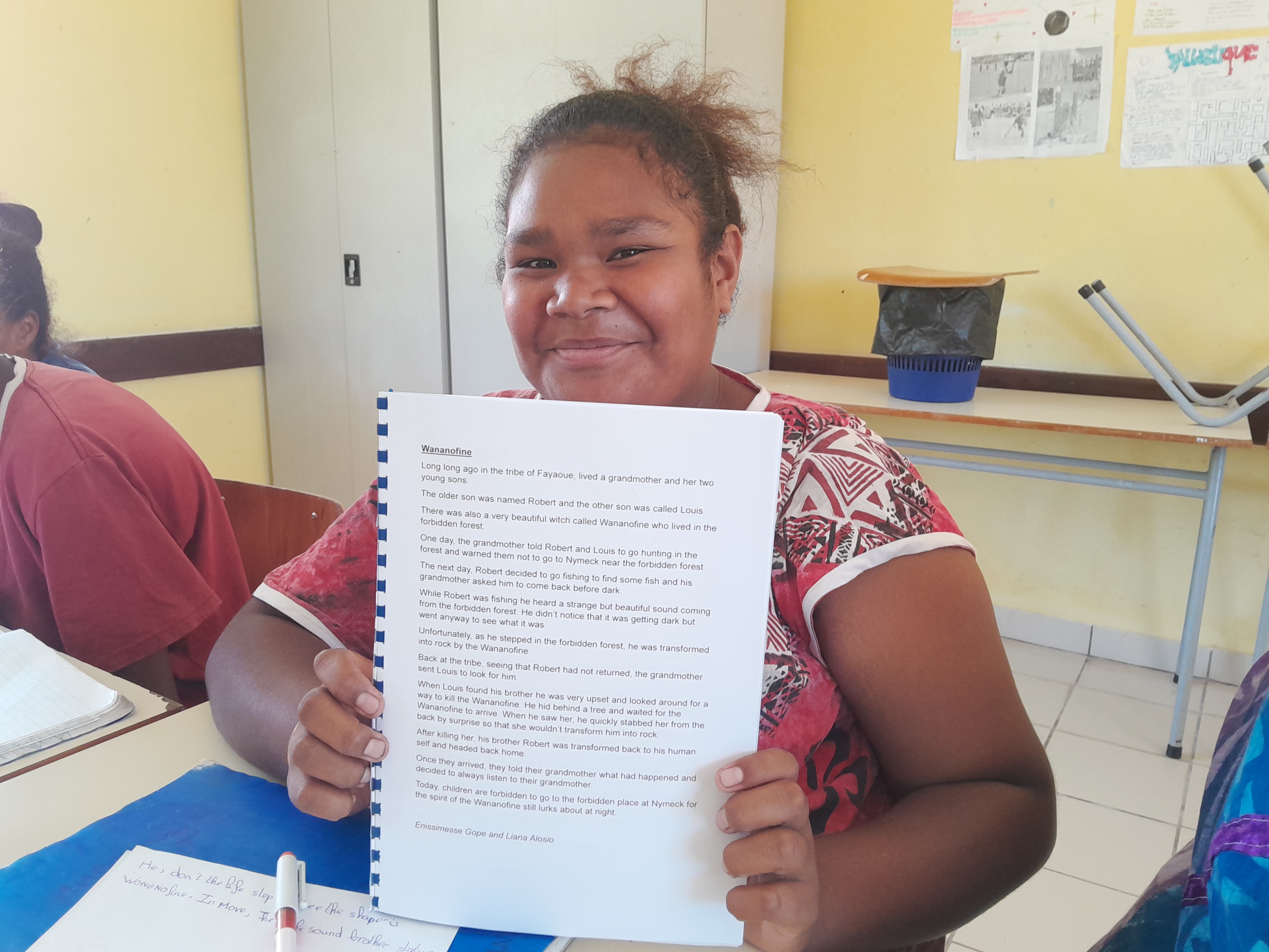 « J’ai repensé à Wanonofine, une légende drehu racontée par notre maîtresse à l’école et j’ai eu envie de la traduire », explique Liana, qui a travaillé avec Enissimesse pour ce projet. D’autres élèves, comme Fétu-Ao et Soumaya ont choisi d’inventer une légende. « Pour nous, l’écriture a commencé avec l’idée d’un lézard qui perd sa queue », explique le binôme.